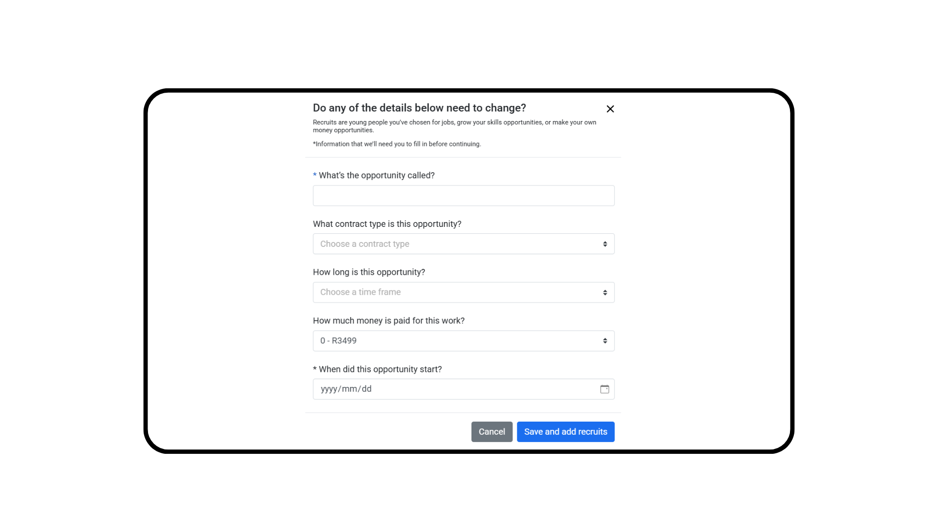 Once you click Add recruits you will need to fill-in and confirm the following details before proceeding.