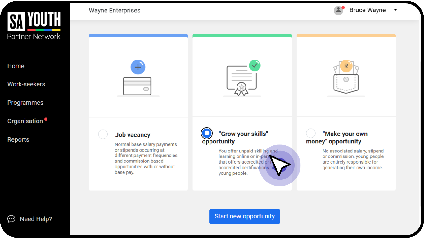 Indicate that this is a 'Grow your skills opportunity' and click on 'Start new opportunity'.