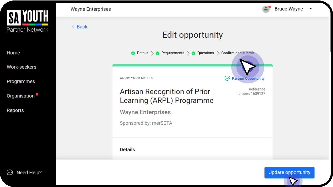 Before posting your opportunity live on the SA Youth platform, you will have a chance to review the advert. If you are happy with how it looks, click Confirm and Submit in the bottom left corner.